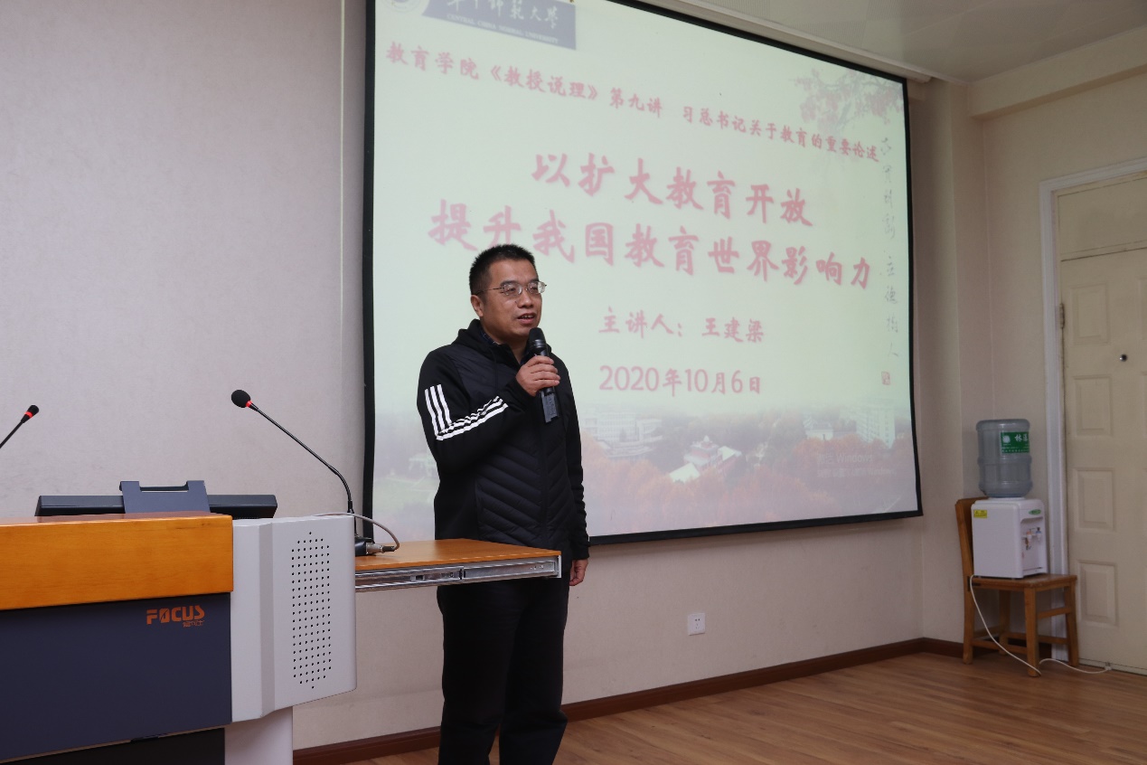 王建梁从教育对外开放是促进我国教育发展的重要动力、党的十八大以来教育对外开放的新成就、我国教育对外开放面临的问题和我国教育对外开放的未来展望四个方面展开阐释。