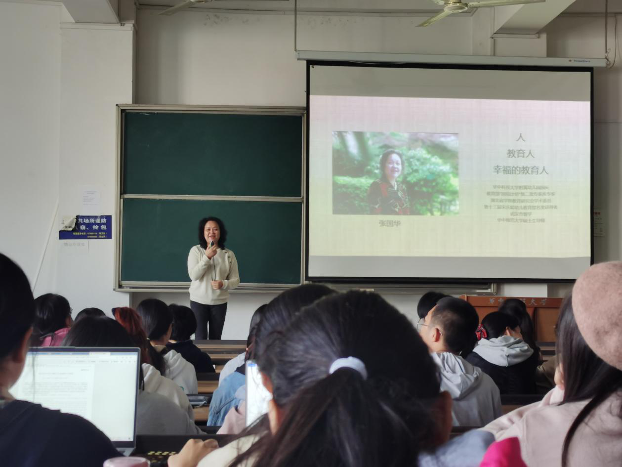 华中科技大学附属幼儿园张国华园长作“走进幼教 靠近幸福”的专题报告。我院雷江华教授、田友谊教授、吴航副教授出席,2020级全体本科生参加,报告会由吴航主持。