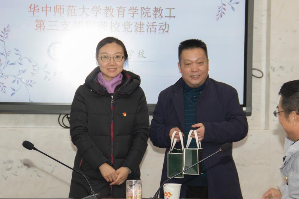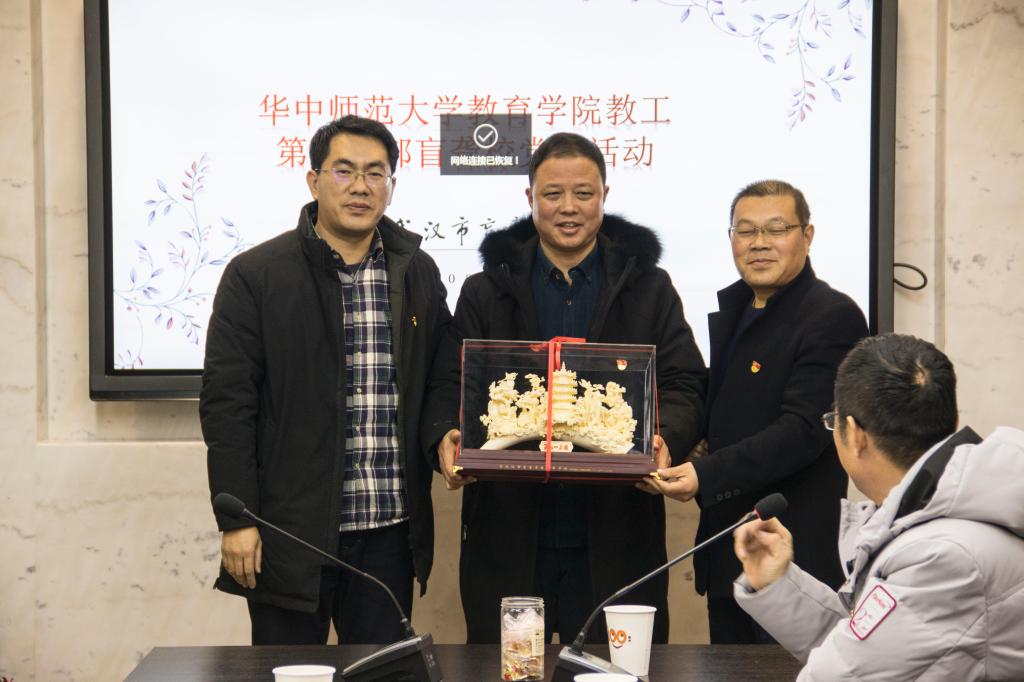 教育学院宣传中心讯(记者 朱楠 施莅)1月2日下午,为深入贯彻落实“不忘初心、牢记使命”主题教育的工作要求,促进特殊教育工作者交流,提升我院特殊教育专业辐射引领作用,由我院党委副书记、院长雷万鹏带队,我院教工第三党支部与武汉市盲童校学校党支部、武汉市第二聋哑学校党支部联合开展主题党日活动。武汉市第二聋哑学校党支部书记霍国举主持活动,武汉市盲童学校党支部书记姜望国、武汉市第二聋哑学校校长刘辛、武汉市盲童学校校长张德志、教育学院党委副书记张扬、教育学院党委副书记黄玉新及三所学校的骨干党员学者、教师及学生代表参加活动。