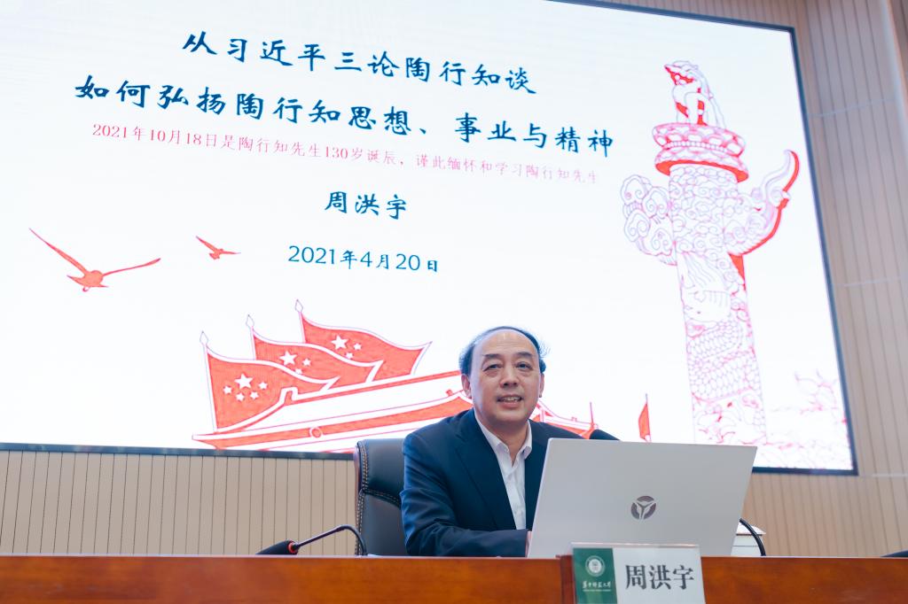 周洪宇为师生们讲述了著名教育家陶行知的生平、经历和成就,深入阐述了其教育思想和爱国精神,以及我们如何继承和发展陶行知思想、事业与精神。他指出,不仅要学习研究陶行知教育思想,还要在理想信念、道德人格、精神品质、思想作风上,学习他人民本位的政治立场和献身教育、播种未来的使命担当,学习他爱满天下的博大胸襟,学习他无私的奉献精神、以身作则的示范精神和开拓求新的创造精神,学习他求真务实的思想作风和知行合一的实践品质。