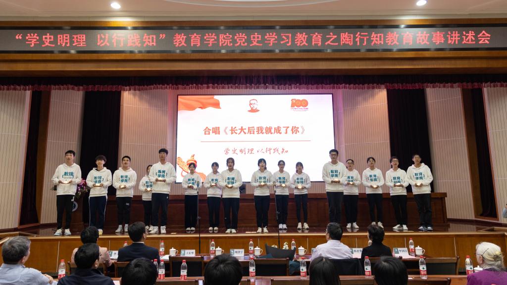 教育学院在校生代表还进行了《传承行知精神教育报国守初心》为主题的诗朗诵,讲述会在《长大后我就成了你》的合唱声中圆满结束。