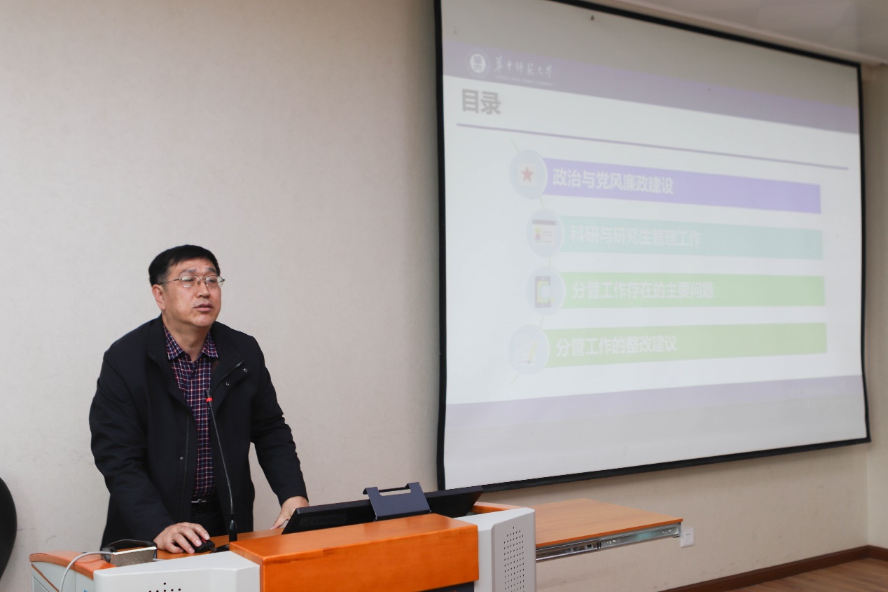 副院长申国昌从政治学习与党风廉政建设、科研与研究生管理工作、分管工作存在的问题和分管工作的整改建议四个方面进行了履职情况汇报。他详细汇报了个人在2020年度完成的“疫情期间研究生应急教学组织方案”、“顺利开展硕士招生远程复试工作”、“完成博士申请-考核制远程复试工作”等十一项工作,重点从研究生招生、培养管理、资助出版专著等方面提出了未来的努力方向。