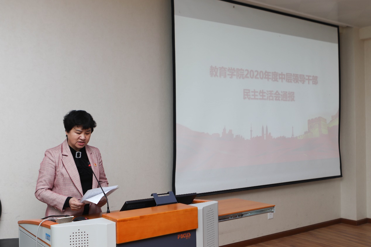最后分党委书记李玲从学习情况、谈心谈话情况,两个方面对教育学院2020年度中层领导干部民主生活会进行通报,并针对问题提出整改措施。
