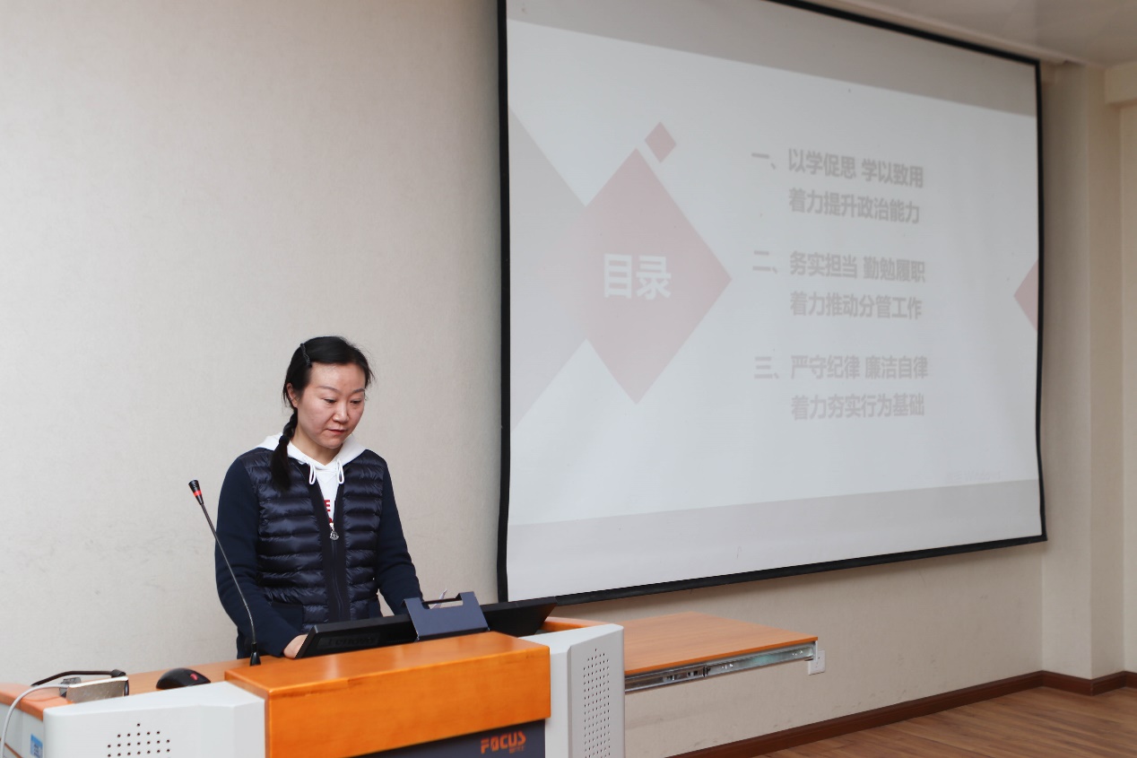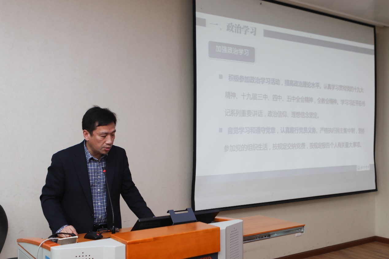 党委副书记黄玉新从“以学促思 学以致用 着力提升政治能力”、“务实担当 勤勉履职 着力推动分管工作”、“严守纪律 廉洁自律 着力夯实行为基础”三个方面进行了工作汇报,介绍了“参与学校抗疫”、“统筹谋划搬家”、“加强创新引领”以及“坚持品牌建设”四项工作内容,最后指出所分管工作存在的问题与不足并明确努力方向。