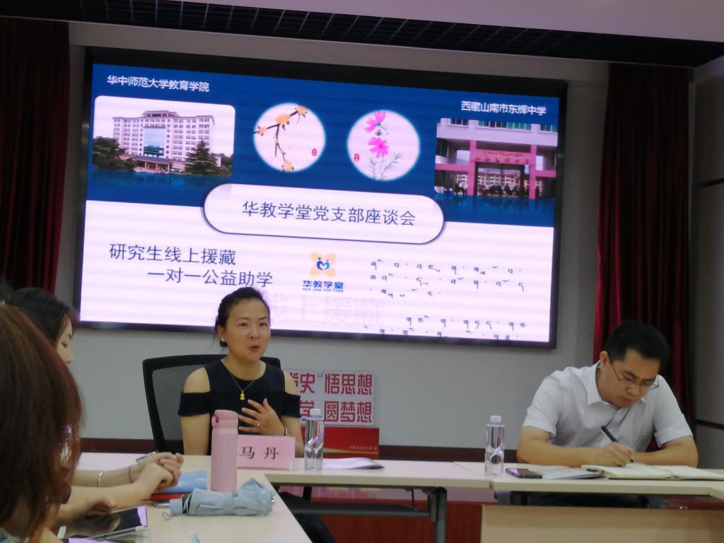 教育学院融媒体中心讯(通讯员 母志蕊)为更好的开展线上援藏助学工作,帮助西藏山南东辉中学学生学习文化知识、培养兴趣爱好、厚植爱国主义精神、加强与内地学生沟通交流,2021年6月14日,教育学院分党委特邀请全国模范教师、全国先进工作者、最美援藏教师马丹亲临华教学堂工作室,与华教学堂的志愿者代表们开展面对面的交流会。华中师范大学教育学院党委副书记张扬、辅导员许家瑞老师以及华教学堂二十余名志愿者代表参加了此次会议,会议由研究生辅导员许家瑞主持。