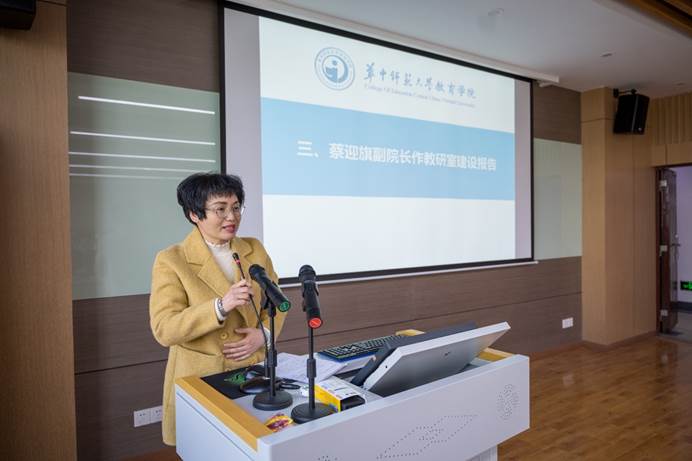 然后,副院长蔡迎旗作主题为《激发本科基层教学组织活力,全面提高本科人才培养质量》的教研室建设报告。报告围绕什么是本科基层教学组织、如何组建本科基层教学组织、本科基层教学组织的职责范围三大问题展开。她总结到,建设一流学科必须以教师教育为特色,从基础上做好人才培养工作。