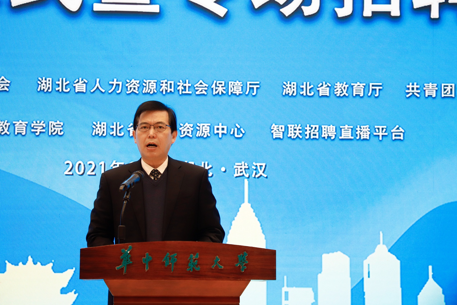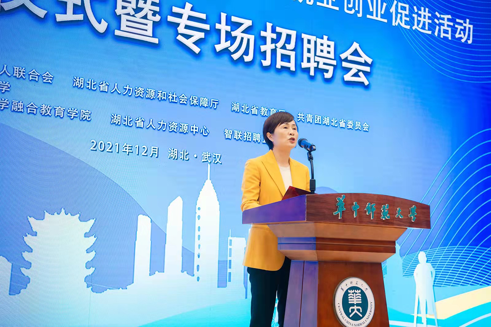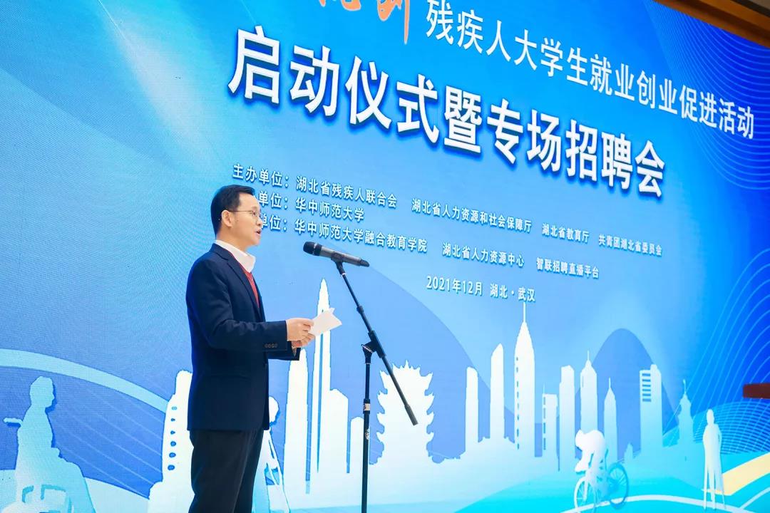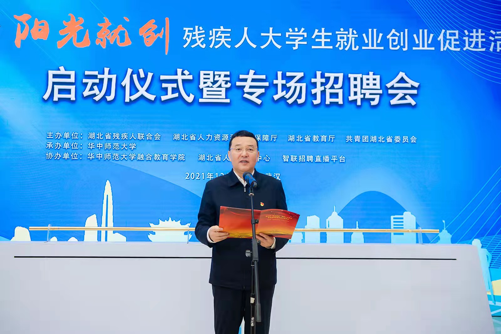 华大在线讯(记者 洪弋乔 见习记者 王丽婧)在“一二三”世界残疾人日到来之际,为推动残疾人更加充分、更高质量就业,12月2日,湖北省“阳光就创”残疾人大学生就业创业促进活动启动仪式暨专场招聘会在我校举行。湖北省委常委、省委统战部部长尔肯江·吐拉洪,湖北省残联党组书记、理事长夏亚灵,校党委书记赵凌云,武钢集团有限公司党委副书记、纪委书记张先贵,副校长夏立新、校党委副书记陈迪明以及省委办公厅、团省委、省残联、省教育厅、省人社厅和我校相关单位负责人出席启动仪式。湖北省政府副秘书长陈家伟主持启动仪式。