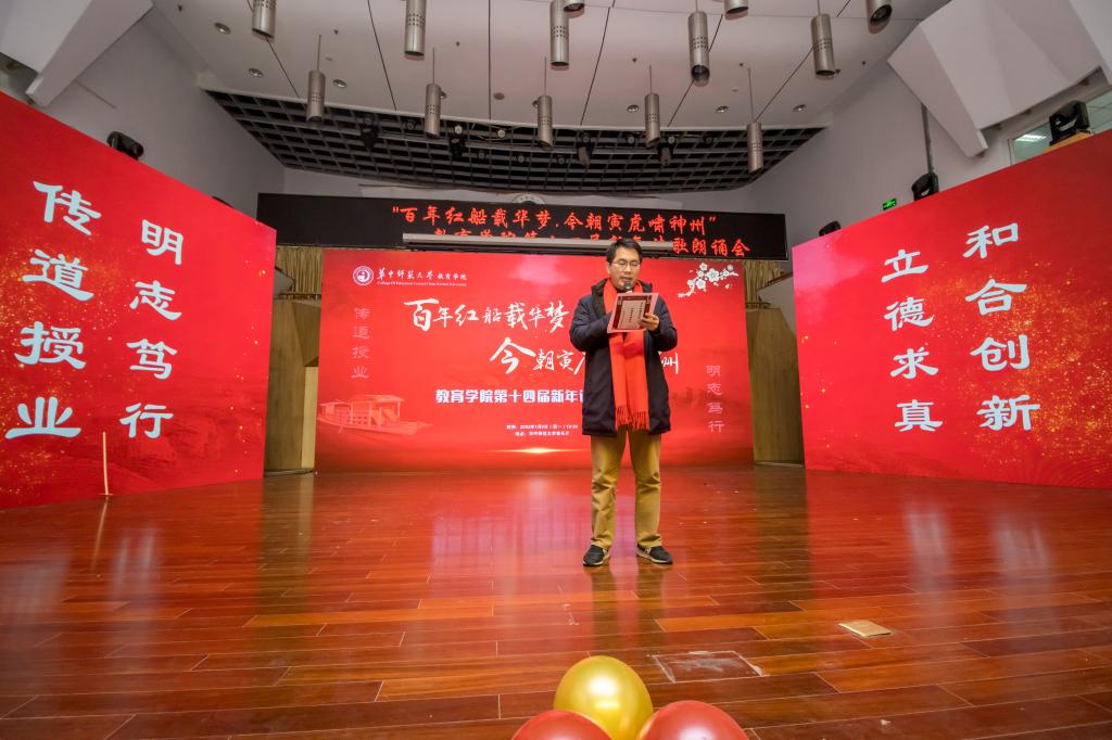 教师是新时代的火炬,点燃教育火种,传递未来希望。在本场晚会中,张扬和黄玉新分别宣读优秀本科生导师和优秀班主任名单,勉励投身教育事业、专注教书育人的十四名优秀教师,李玲、董泽芳、陈佑清等分别为获奖教师颁奖。晚会进入下半场,研究生会编排的话剧《王亚南——资本论传奇》开演,用生动的表演演绎出华师人王亚南对爱国情怀的坚守与对救国使命的担当。伴着《我和我的祖国》的音乐响起,会场气氛再度进入高潮,全场观众与全体演职人员齐声高歌,表达对伟大祖国的热爱和祝福。