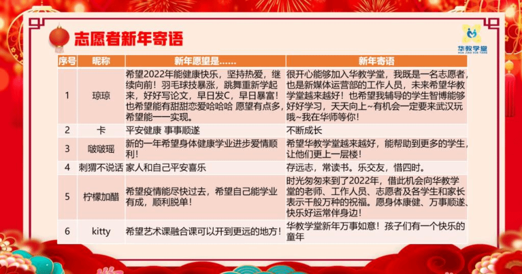 “感谢华教学堂给了这么好的平台,更感谢小赵老师给予帮助和教导,祝老师新年快乐、万事如意。”新疆哈密市白佳乐妈妈说道。内蒙古呼和浩特五年级学生苗诗琪诚挚地祝愿华教学堂能培育出更多的人才,愿学堂明天更加辉煌。宁夏回族自治区学生石国雄坦言自己在华教学堂得到了很多学习上的帮助,非常感谢老师的无私教导。宁夏三年级学生张殷梓涵说,“感谢罗老师对我的付出,我的成绩提高了,新的一年我不会辜负您的期望。”广西宝美小学三年级学生隆枷杞也为大家送上了真挚的新年祝福。