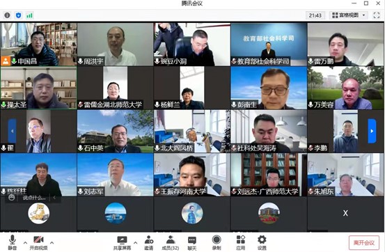教育学院融媒体中心讯(通讯员 党波涛 申慧宁)2月19日上午,教育部哲学社会科学研究重大委托项目“习近平总书记教育重要论述研究”推进会在线上成功举行,出席本次推进会的领导有教育部社会科学司司长徐青森、全国人大常委会委员、湖北省人大常委会副主任、中国教育学会副会长、华中师范大学国家教育治理研究院院长周洪宇、华中师范大学党委书记赵凌云、华中师范大学副校长彭南生。受邀参会的专家有:清华大学教育研究院院长石中英、北京大学教育学院院长阎凤桥、华中科技大学教育科学研究院院长陈廷柱、华中师范大学马克思主义学院院长万美容和教育学院院长雷万鹏。课题组成员中国教育报刊社党委书记、社长翟博、北京师范大学教育学部部长朱旭东、河南工业大学党委书记刘志军、广西师范大学副校长孙杰远、北京师范大学中国教育政策研究院执行院长张志勇、汉江师范学院党委书记杨鲜兰、湖北师范大学副校长雷儒金、太原师范学院党委书记张惠元、南京大学教育研究院副院长操太圣、华中师范大学国家教育治理研究院执行院长申国昌等参会。