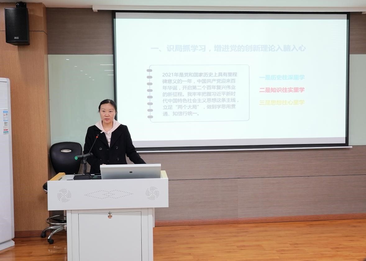 李玲进行个人述职述廉。她以“一流党建引领学院高质量发展”为主题,从坚持学深悟透、建强基层党组织、构建大思政格局、始终把政治建设摆在首位、落实一岗双责、建设平安校园等六个方面汇报2021年度抓党建工作的成绩和经验,分析了存在的不足,提出实施“政治建设领航”计划、“思想建设铸魂”计划、“组织建设强基”计划、一流建设赋能”计划的工作思路。