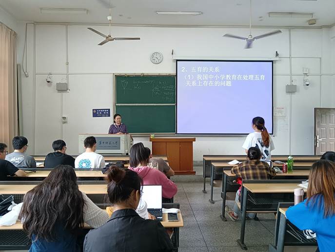 在对“五育”进行分析后,董英副教授重点引导学生理解“五育”之间的关系。她从我国中小学教育在处理“五育”关系上存在的问题入手,激发学生思考、参与讨论,进而探讨如何正确理解“五育”的关系。在讨论中,她指出在我国中小学教学实践中,由于简单主义、机械主义等的影响,长期存在将“五育”的理论范畴实体化以及厚此薄彼、重此弃彼等问题,如将“五育”理解为五种独立的教育或学科、美育与劳动技术教育时间被智育接管等。
