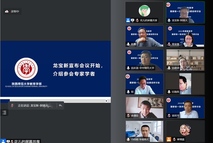 教育学院融媒体中心讯(通讯员 田友谊)为进一步加强教育学国家级一流本科专业建设,强化各建设点之间的深度交流,2022年5月7日下午,由陕西师范大学教育学部主办的“新文科背景下教育学专业的高质量发展”研讨会在线召开,陕西师范大学、北京师范大学、华中师范大学、南京师范大学、华南师范大学等高校专家学者和学生代表150余人在线参会。会议由陕西师范大学教育学部龙宝新副院长主持。