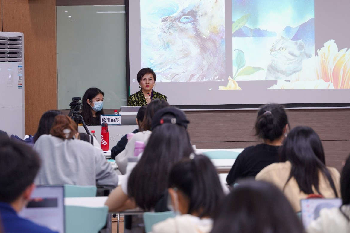 欧阳丽莎从美育的含义、历史谈起,结合自己的创作经历,揭示美学在生活中的体现。通过展示《猫》、《冬日马蹄莲》、《一个人的房间》等个人美术作品,她揭示了“描绘微观细节,传达丰富意蕴”这一创作理念。