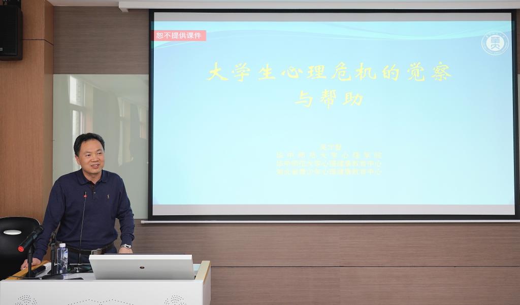 围绕提升教师的心理育人能力,吴才智以“大学生心理危机的觉察与帮助”为题作专题报告。吴才智由真实学生危机案例出发,辅之以图表统计数据,对心理危机的发现机制、预警机制、评估机制、干预机制、转介机制、随访机制等进行了深入浅出地讲解。就如何帮助学生摆脱心理危机这一问题,他强调,作为教师应转变观念,积极传播“勤于自助,善于求助,乐于互助”的心理健康理念,提高对大学生心理危机的觉察度和敏感性,秉承“询问、倾听、确认、劝说、转介、陪伴”的援助策略,当好危机预防的“守门员”。