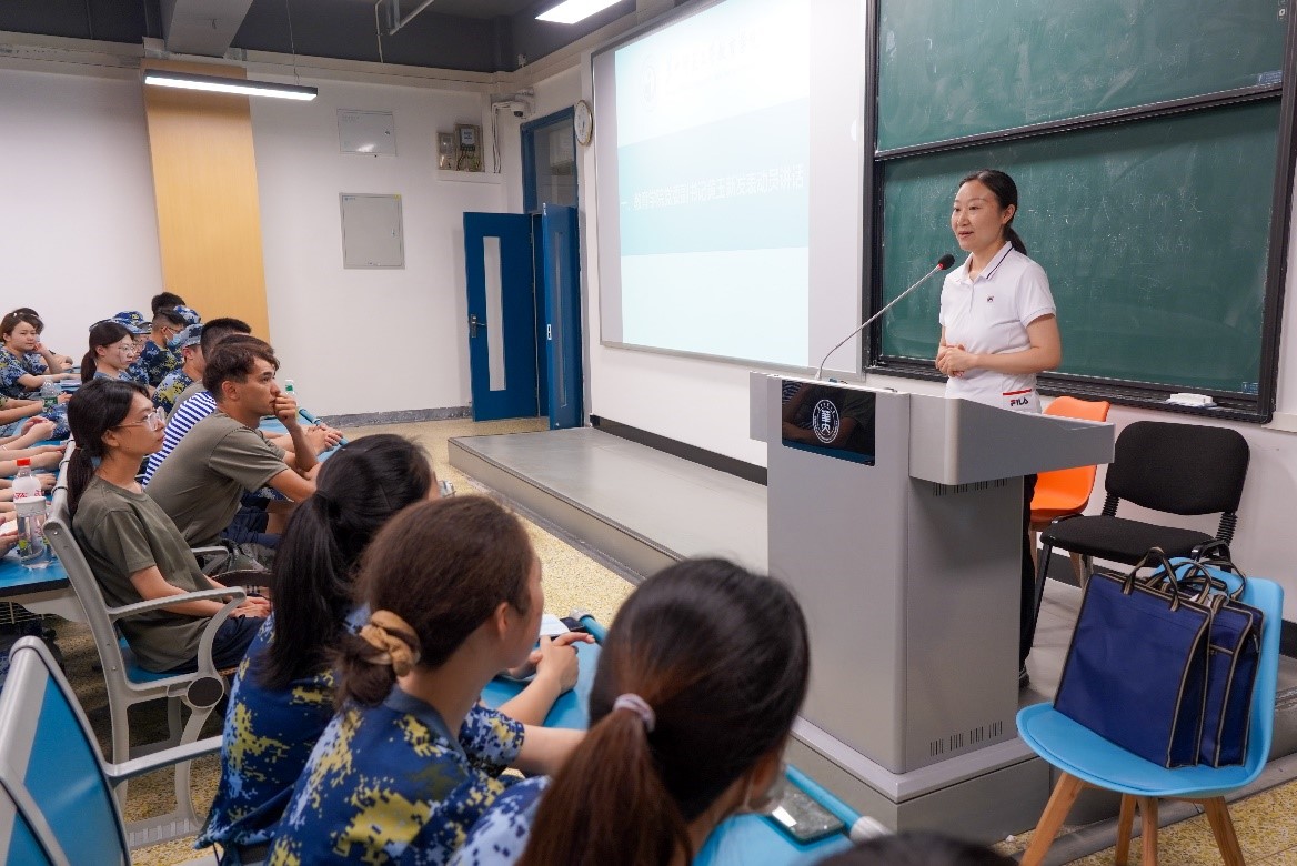 黄玉新做动员讲话,从“两个第一次”和“三点期待”两方面进行说明。她指出,本次军训有着特殊的首创意义,吸纳退伍军人担任教官。她希望参训同学能本着敬畏军训的态度,带着享受军训的心情,实现收获军训的结果,以积极昂扬的精气神、奋勇争先的拼搏劲为连队阵地建设、学院风采展现贡献力量。