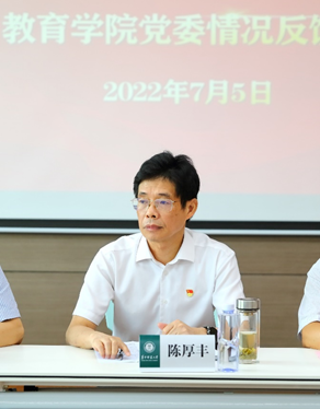 教育学院融媒体中心讯(记者 覃娟 王健)7月5日上午,根据学校党委统一部署,华中师范大学党委第四巡察组巡察教育学院党委情况反馈会在田家炳楼905报告厅召开。校党委副书记、纪委书记陈厚丰、巡察办主任王旺胜、学校党委第四巡察组组长、学生工作部副部长、学生事务处处长杨军、学校党委第四巡察组副组长、校友工作办公室副主任易吉林、巡察组成员法学院党委副书记万枞、心理学院党委副书记苏晓刚、科技处胡志荣、研究生院丁宇、巡察办李连杰出席会议,教育学院党政班子全体成员、全体教职工、退休教职工代表、学生代表等参加会议。会议由教育学院院长、党委副书记雷万鹏主持。