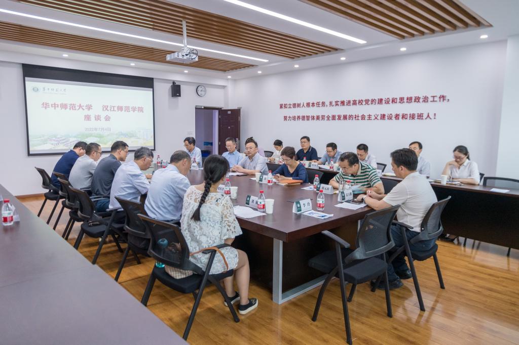 教育学院融媒体中心讯(通讯员 王晓玥)2022年7月4日下午,汉江师范学院党委常委、副校长陈俊,学校办公室主任刘成,教育学院院长郑传芹,发展规划处副处长郭顺峰,教育学院副院长夏小林,教育学院刘巍副教授,姚炎昕副教授,刘美辰老师一行8人来我校商讨师范院校“协同提质计划”。华中师范大学副夏立新校长、学校发展规划处处长段锐、研究生院副院长张舜、本科生院副院长胡中波、教育学院书记李玲、教育学院院长雷万鹏及部分专家学者参加了座谈会,会议在田家炳大楼909会议室举行。