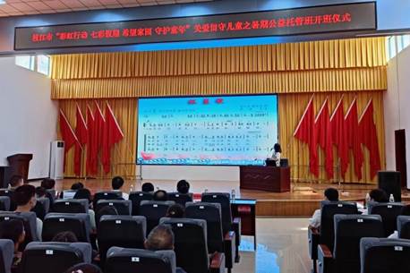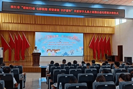 教育学院融媒体中心讯(通讯员 赵承 雷欣怡)7月16日,湖北省宜昌市枝江市“彩虹行动•七彩假期•希望家园•守护童年”关爱留守流动儿童之暑期公益托管班开班仪式在顾家店镇举行。湖北省妇女干部学校副校长张家燕,宜昌市妇联党组成员、副主席程智,枝江市委常委、市委统战部部长董广华等领导出席,各大学志愿服务队全体成员,市委宣传部、市委文明办、市教育局、市妇联等各部门相关负责人,顾家店镇“守护童年”项目结对帮扶爱心妈妈及全体留守儿童参加。