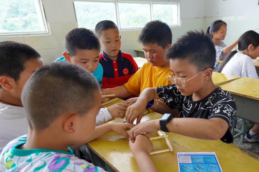 图片三:红军小学学生在课上合作搭建倍力桥