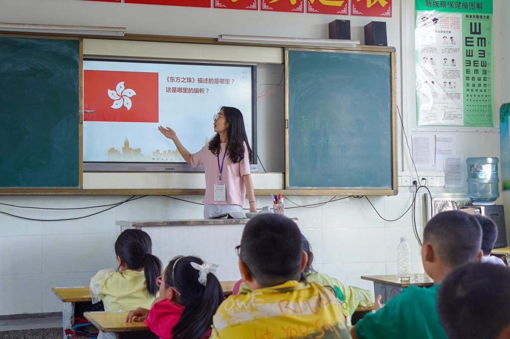 图片一:实践队员为红军小学学生讲授“香港回归祖国25周年”主题课程