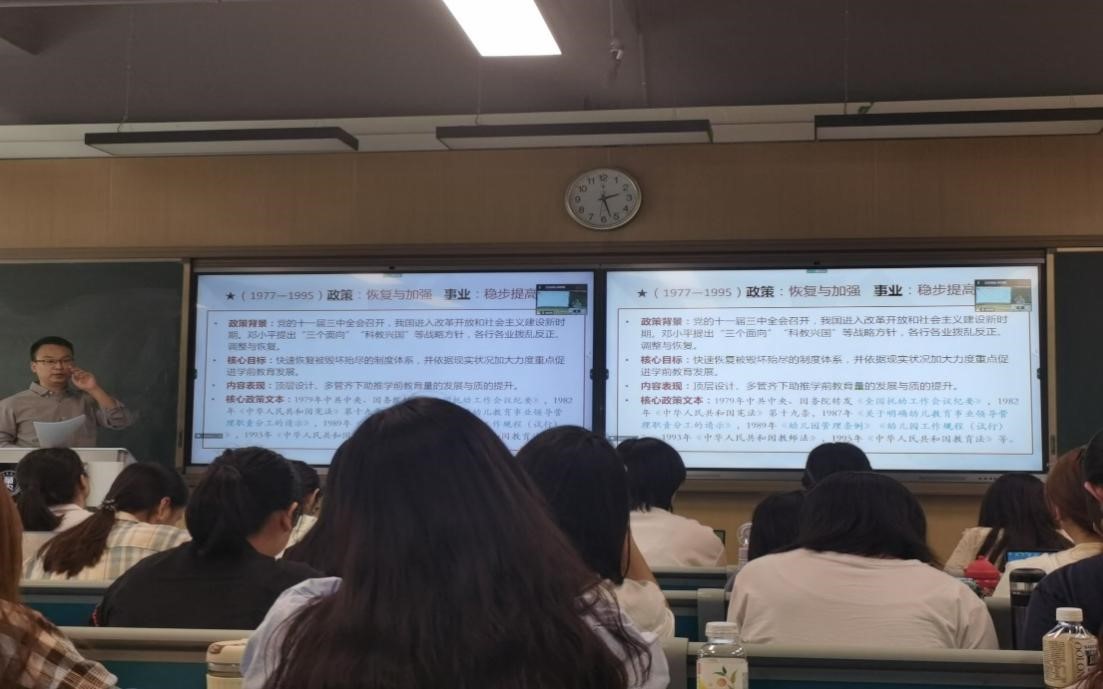 在教学中,尹国强重点引导学生关注新中国成立以来出台的各项学前教育政策与法规,以政策文本激发学生思考,进而展开讨论。在讨论中,他指出教育政策与法规立足于时代背景与民族文化,兼顾科学性与思想性,是值得学前教育工作者紧密关注的领域。整个教学逻辑严密、内容丰富,互动充分,注重调动学生学习的主观能动性。