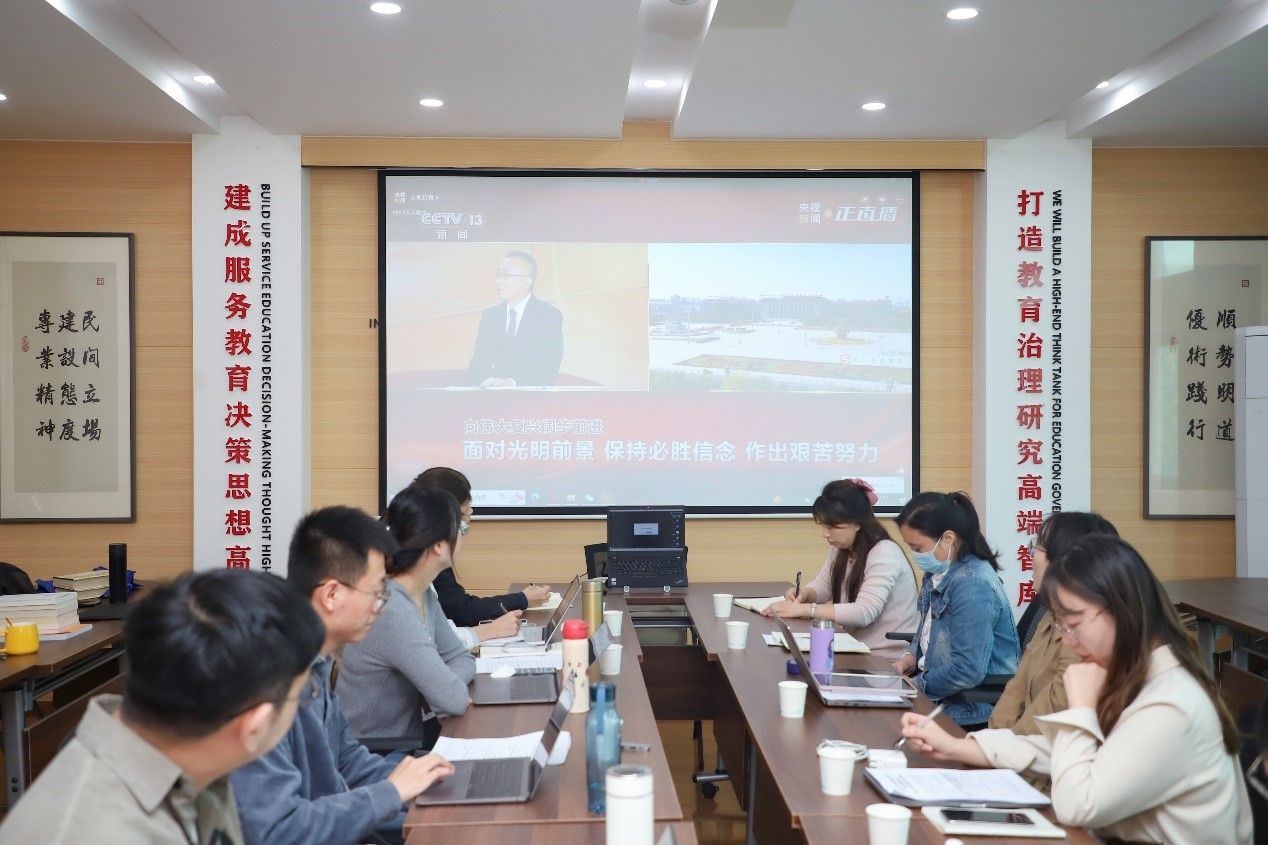 最后,周洪宇就《习近平总书记教育重要论述研究》丛书的编撰提出了六点建议:第一,课题组成员务必深入学习党的二十大精神,将最新精神和最新要求吸收进丛书的编写,进一步提高丛书的政治高度、政策高度和理论高度;第二,凸显学术研究特色;第三,研究思路要坚持问题导向;第四,要坚持三个“主”,即主题、主线和主见;第五,在工作方法上,要坚持历史与逻辑相结合、逻辑与理论相结合、整体与局部相结合、研究与阐释相结合;第六,要注意学术规范。在会议最后,华中师范大学国家教育治理研究院与会人员还集体实况收看了中国共产党第二十届中央政治局常委同中外记者见面会。