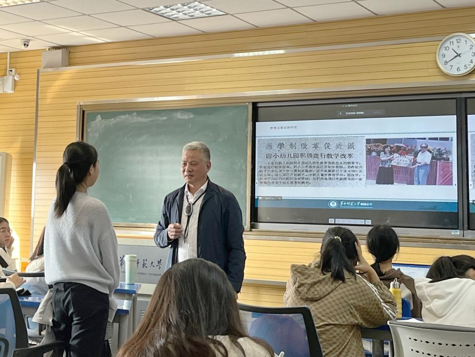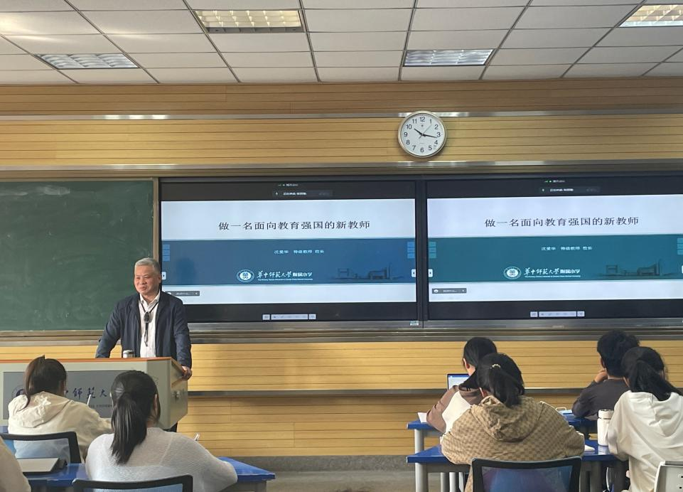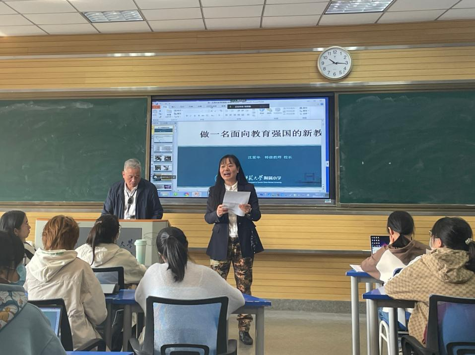 首先,沈爱华通过照片介绍了华中师范大学教育学院与附属小学的密切联系,重温了华中师范大学附属小学的发展历史,回顾了华中师范大学教育学院师生在附属小学开展的教育教学等活动,引导同学们对教育进行思考。