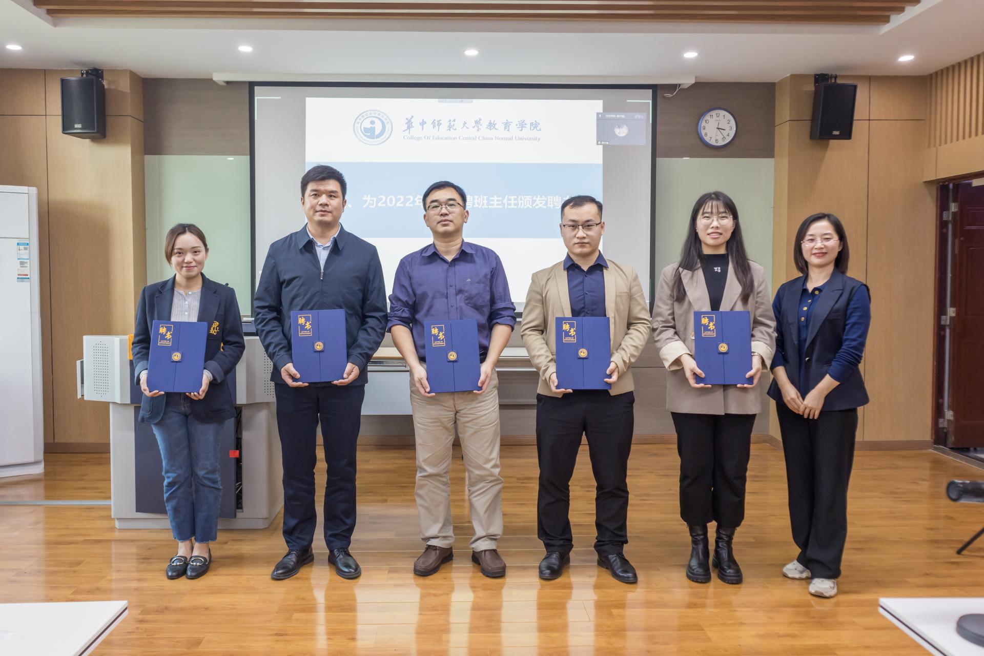 苏春艳宣读《关于聘任华中师范大学教育学院2022年度本科生班主任、外聘班主任的决定》,李刁、苏春艳先后为2022级本科生班主任代表、2022年度外聘班主任代表颁发聘书。
