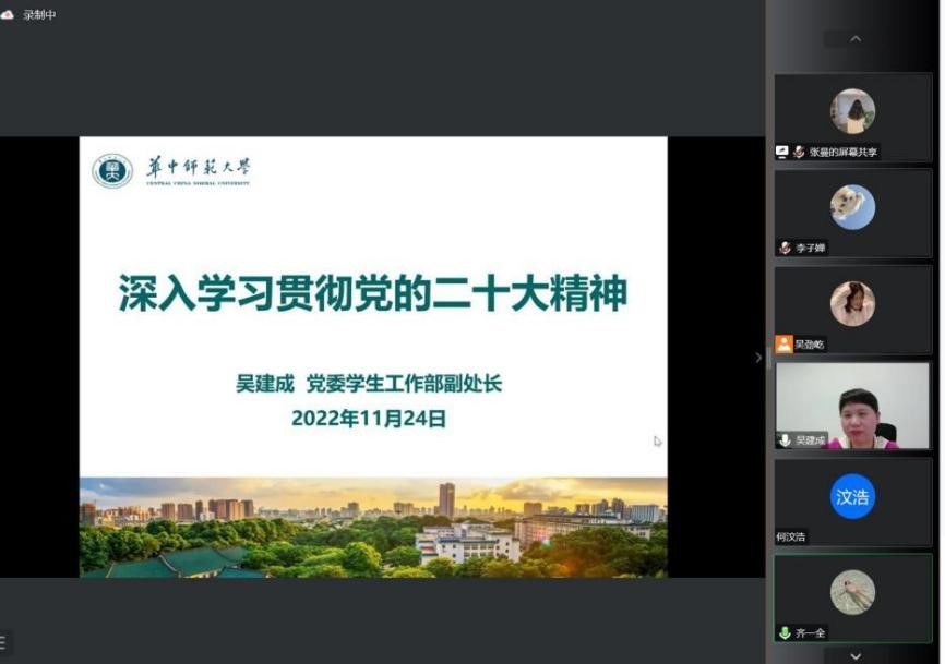 教育学院融媒体中心讯(通讯员 张曼)11月24日下午,为深入学习贯彻落实党的二十大精神,引导党员立志做有理想、敢担当、能吃苦、肯奋斗的新时代好青年,教育学院硕士研究生第六党支部以线上的方式开展特色主题党日活动。学校党委学生工作部吴建成副处长受邀出席并讲授专题党课,活动由党支部书记李子婵主持,支部全体党员参加。