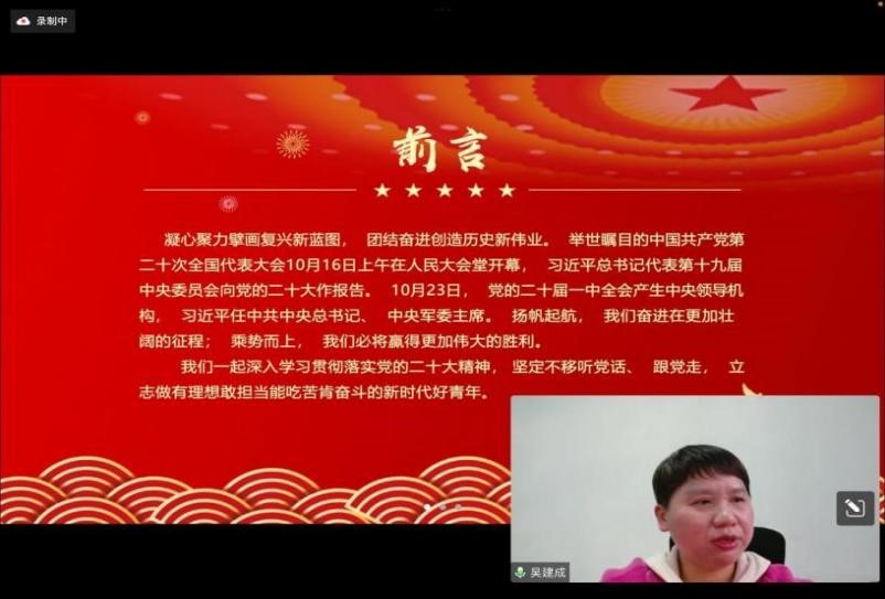 会上,吴建成讲授题为“深入学习贯彻党的二十大精神”的专题党课,她首先简要地介绍了党的二十大报告中的有关内容,侧重对“五个牢牢把握”进行了深入阐释。她呼吁党员同学要更加紧密团结在以习近平同志为核心的党中央周围,牢记习近平总书记的嘱托,立志做有理想敢担当能吃苦肯奋斗的新时代好青年,以青春之我、奋斗之我投身于伟大事业,撸起袖子加油干,一棒接着一棒跑,在火热实践中展现担当作为、施展抱负才华,为全面建设社会主义现代化国家作出新的贡献。