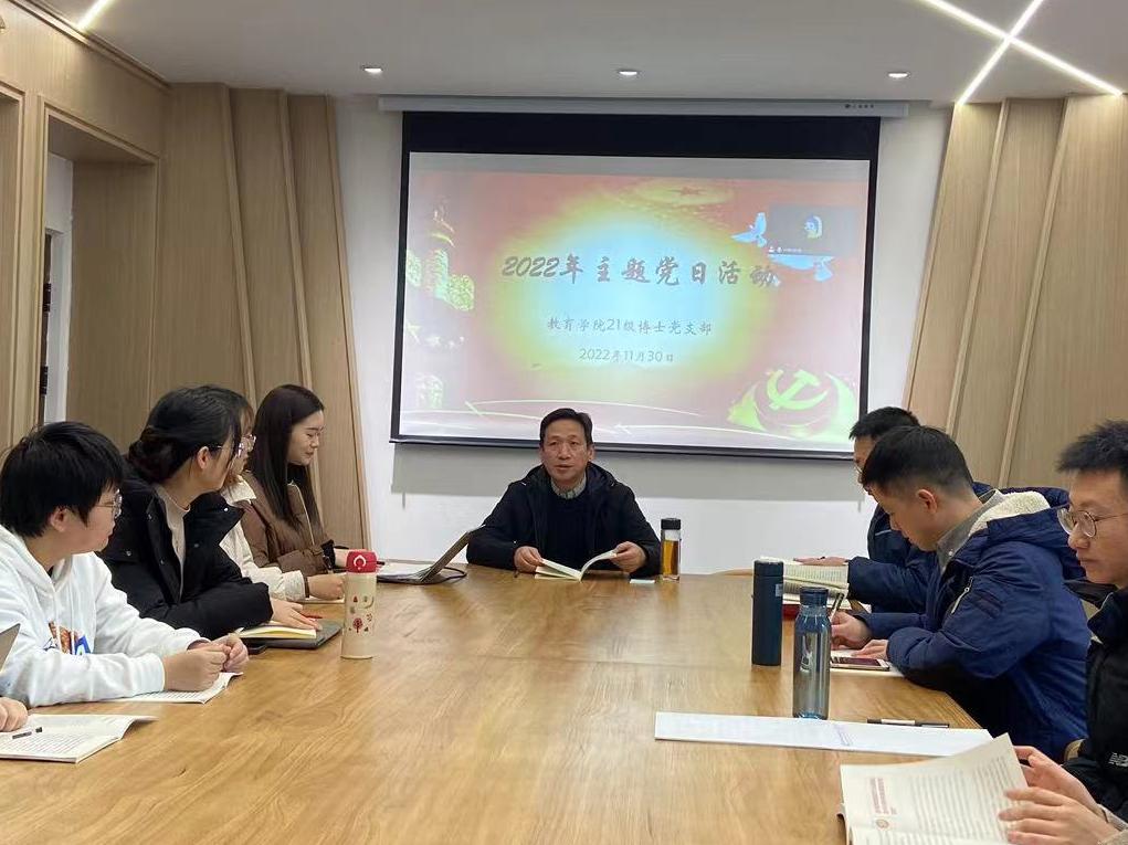 教育学院融媒体中心讯(通讯员 游子欢) 为进一步加强基层党建工作和学习贯彻党的二十大精神,11月30日上午,教育学院院长雷万鹏教授在田家炳党员活动室为21级博士生党支部开展“系统解读党的二十大精神”的特色主题党课活动。研究生院副院长张舜教授(外聘班主任)及21级全体博士生党员共同参与,会议由党支部书记游子欢主持。