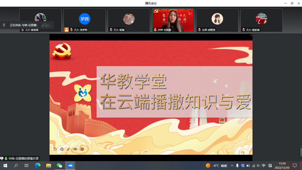 任丽蓉同志首先介绍了华教学堂的创设历程。从疫情之初面向疫区医务工作者子女的爱心助学,到后疫情时代面向边远地区孩子的线上一对一辅导,华教学堂这个由数百名研究生党员组成的公益助学组织已经走过了三个春秋,目前累计辅导学生592人,助学对象涉及9省16市1个自治州的48所学校。为加强华教学堂组织建设,凝聚党员干部的战斗力,华教学堂党支部在建党百年之际正式成立。自支部成立以来,党员同志们更加积极地投身线上助学实践,在助力教育事业发展的同时也实现着自身的专业成长。接着,任丽蓉同志介绍了华教学堂的助学模式和助学内容。华教学堂根据不同地区和学生的需求,将一对一辅导、一对多教学、实地家访调研等多种形式相结合,开展了基础学科课程辅导、艺术融合课程教学、心理健康辅导等工作。最后,任丽蓉同志着重介绍了华教学堂党支部的建设工作。为了发挥党的建设引领作用,在开展好支部工作的同时助力华教学堂整体发展,党支部通过多种形式推进思政育人。支部充分挖掘各地红色资源,面向援助地区的学生制作了“榜样力量”主题系列微党课和红色故事育人手册、录制了红色遗址研学视频,将思政育人落实到线上助学工作之中。此外,支部为加强组织建设,提升党员同志综合素养,还开展了急救培训、健康讲座等一系列特色活动。目前,华教学堂党支部已入选华中师范大学研究生样板党支部。未来,支部将继续加强自身建设,将支部发展与助学工作紧密结合,充分发挥党员的带头作用,为我国教育事业的发展添砖加瓦。