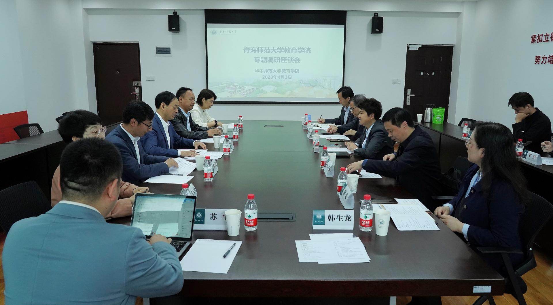 教育学院融媒体中心讯(通讯员 王健 晋婉莹)2023年4月3日,青海师范大学教育学院院长李晓华教授、教育学院副院长张春海副教授、教育学科负责人包万平副教授、教育博士专业学位负责人宋维玉副教授、教育技术专业负责人马文娟副教授、学科建设与研究生科秘书苏平老师、院办公室韩生龙老师一行七人来我院调研交流。教育学院党委书记李玲、人工智能教育学部副部长刘清堂教授、教育学院副院长雷江华教授、课程与教学论导师组组长陈佑清教授、教育领导与管理导师组组长蒲蕊教授、教育信息技术学院教育技术系主任罗恒副教授、科研与博士研究生教学秘书张汶军老师、学科建设与国际化秘书杨文黛老师接待来访专家,在田家炳909会议室举行交流座谈会。