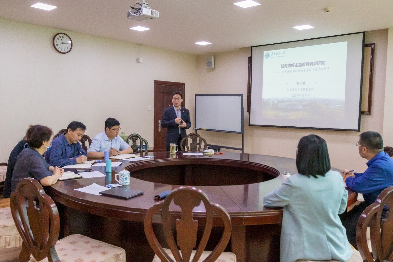 教育学院党建中心讯(通讯员 覃娟 唐璐 吴姗姗)5月22日上午,我院学习贯彻习近平新时代中国特色社会主义思想主题教育专题读书班暨专题党课在田家炳403会议室举行,院长、党委副书记雷万鹏进行党员领导干部专题读书班领学,并以“如何做好主题教育调查研究——乡村教育调研助推教育学一流学科建设”为题讲授专题党课,本次活动由党委书记李玲主持,全体党委中心组成员参加。