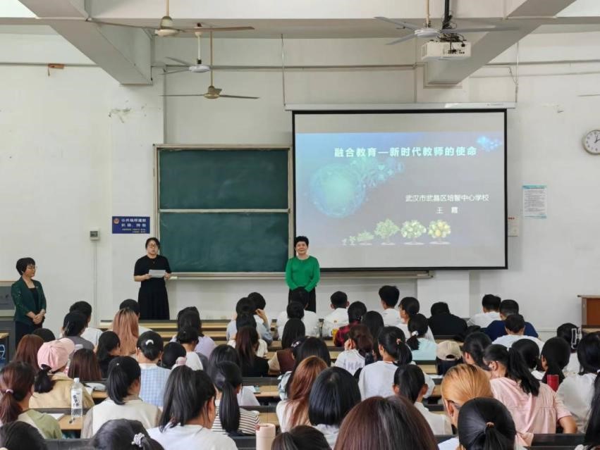 教育学院融媒体中心讯(通讯员 张江丽)2023年10月18日下午,《新生研讨课》在9号楼9201教室成功举办了外聘专家讲座。武汉市武昌区培智中心学校校长、湖北省特殊教育教学指导委员会副主任委员、我校特殊教育专业硕士校外导师、全国扶残助残先进个人王霞女士受邀为同学们做了题为“融合教育——新时代教师的使命”的专题讲座。教育学院2023级全体本科新生参与了此次讲座,蔡迎旗教授、孙玉梅副教授等教师代表参加,讲座由孙玉梅主持。