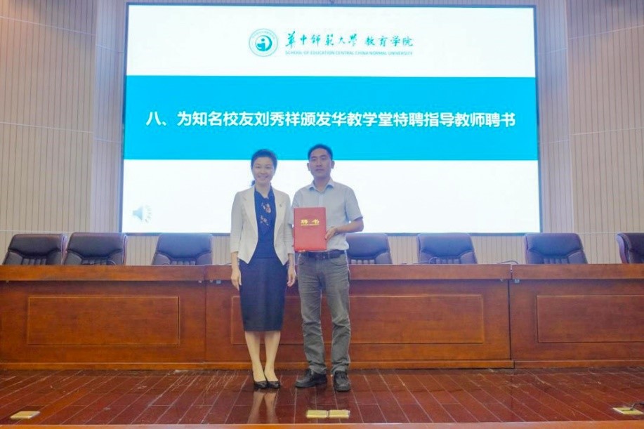 陈雪玲为知名校友刘秀祥颁发华教学堂特聘指导教师聘书。