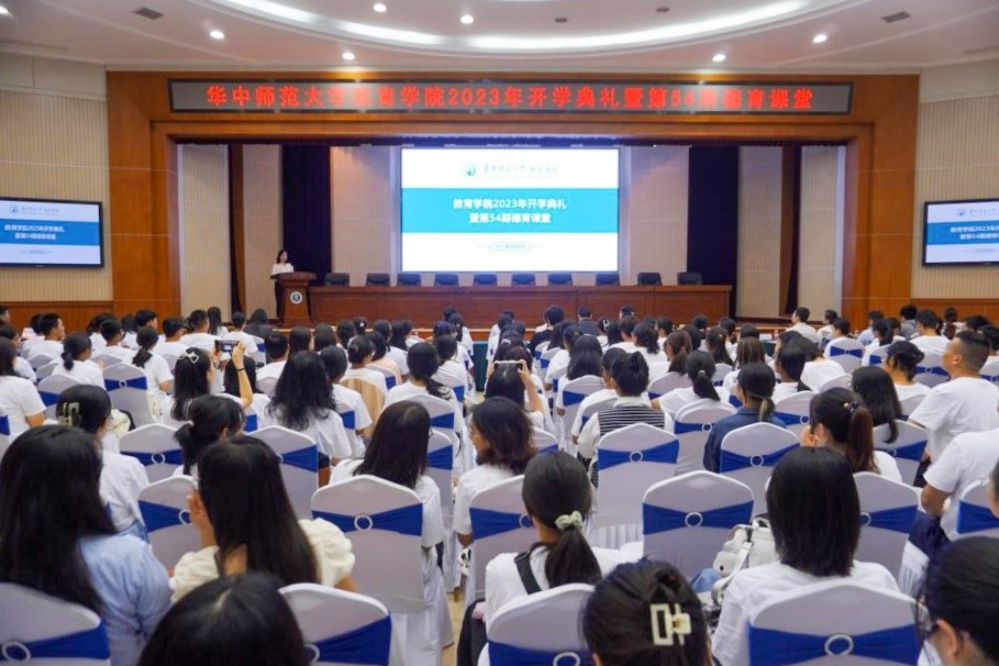 教育学院融媒体中心讯(通讯员 蔡亚男) 9月26日下午,华中师范大学教育学院2023年开学典礼暨第54期德育课堂在科学会堂一楼报告厅举行。党的二十大代表、贵州省望谟县实验高中副校长刘秀祥,教育学院党委书记陈雪玲、副书记苏春艳、副院长田友谊、副院长雷江华、教育学系主任程红艳,2023级本科生班主任代表、本研辅导员代表以及300余名本研新生参加活动。活动由苏春艳主持。