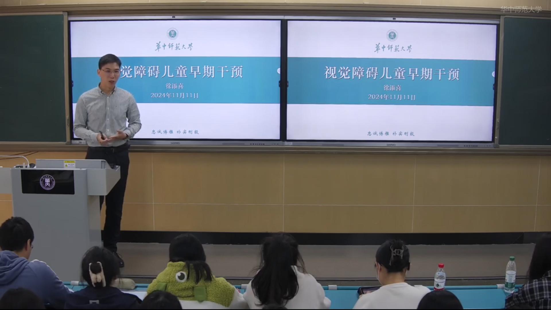 本次展播课程由徐添喜教授担任主讲人,讲授内容为“特殊儿童早期干预——视觉障碍儿童早期干预”。人文学院副院长陈蓓、经济与工商管理学院副院长周维第和学院副院长郑刚、特殊教育系教师团队参加了展播课。