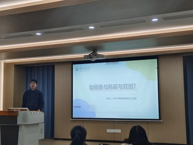 王书欣结合自身的科研经历向同学们分享了项目申报经验。他以“如何参与科研与双创”为题,将参与双创项目的方式逐层拆分,用创意流程图的方式生动形象地展现出来。他还介绍了一些获取双创信息的途径和资源,为同学们提供了具体可操作的方案,让同学们参与“双创”有据可依。