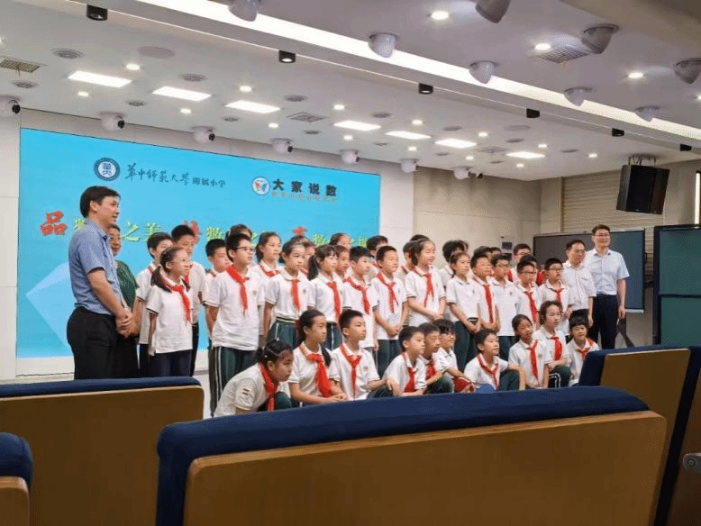 5月20号下午,华中师范大学数学与统计学院的郭玉劲教授与四五六年级各班的学生代表在阶梯教室开展了以“数学的力量”为主题的大家说数活动。郭教授从日常生活中的数学智慧、自然界中的数学魔法、科学技术中的数学秘密向我们展示数学在我们周围无处不在。在交流过程中,学生代表积极举手提出自己在数学学习中的疑问,郭教授也进行了细致的讲解。各位学生代表也在做小小数学家的路上更进一步。