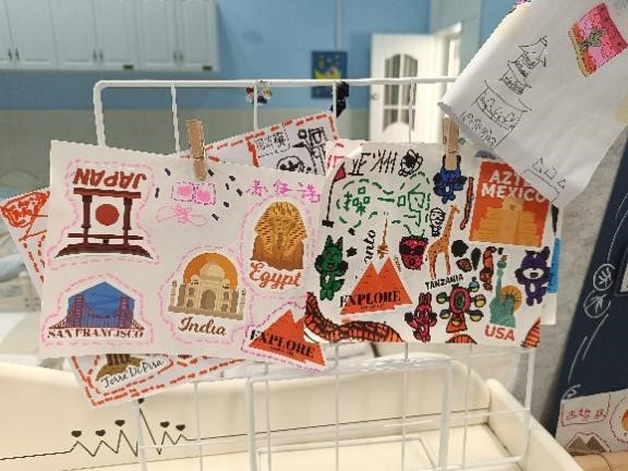 除了周三会开展盛世号游轮游戏活动,其他时间会在班上进行区域活动,班级会根据每学期的大主题,每周更新班上对应区域的主题游戏。本学期大班的区域大主题是世界游,我们大四班结合大主题与班级设置的区域进行挂靠。比如在文创馆进行世界之旅主题手账的制作,在图书区进行世界建筑主题书签的制作等等。