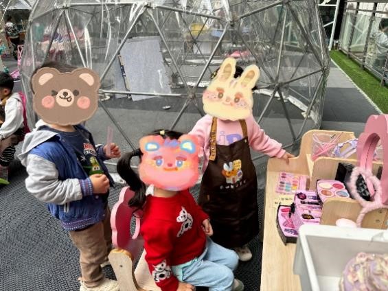 在美容美发舱,有美甲,化妆,洗头,造型等特色活动。老师会选择四个小朋友分别扮演美甲、化妆、洗头和造型的店员,其他小朋友则扮演顾客去四个店员那里打扮自己。在这里,孩子们可以充分发挥自己的个性,表达自己的偏好,也学会了要尊重他人。