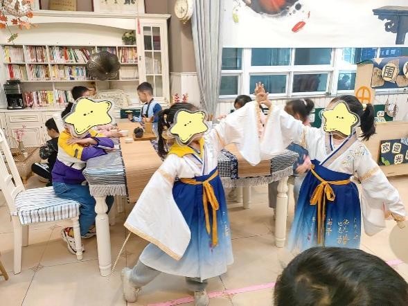 茶艺舱里,孩子们可以自由选择角色,包括老板、服务员(倒茶、打扫、叫卖、表演)、顾客。随后便布置场地,摆放上茶具、茶叶、水壶等必要的工具和材料,此外还准备一些装饰性的物品,如桌面摆件、蒲团、茶盘、焚香工具等,增加茶艺舱的氛围,模拟茶馆的经营模式。游戏结束后,老师引导孩子们一起清理茶具并且对游戏进行总结分享,肯定孩子们在游戏中的表现和努力,并给孩子们发放工资,培养孩子们的责任感和团队合作精神。