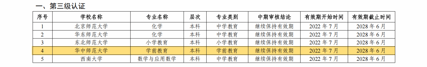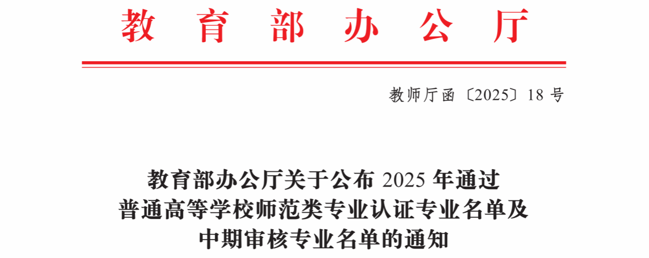教育学院媒体中心讯(通讯员 吴航 曹心怡)近日,教育部办公厅正式发布了《关于公布2025年通过普通高等学校师范类专业认证专业名单及中期审核专业名单的通知》(教师厅函〔2025〕18号)。我院学前教育专业顺利通过普通高等学校师范类专业第三级认证中期审核,继续保持有效期。