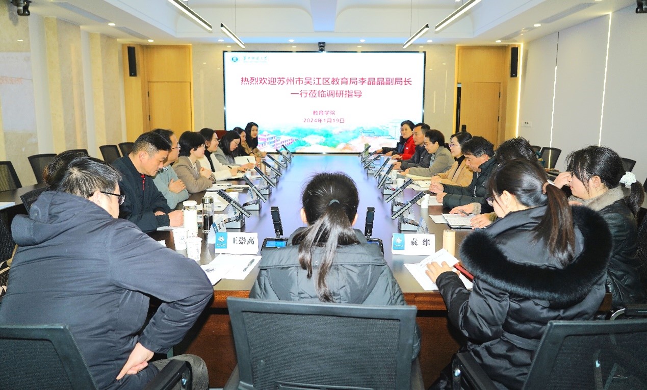教育学院融媒体中心讯(通讯员 覃娟 詹思迪 王健 )2024年1月19日,苏州市吴江区教育局调研座谈会在田家炳教育书院901学术报告厅顺利召开。苏州市吴江区教育局副局长李晶晶等一行到我院调研,教育学院党委书记陈雪玲、党委副书记苏春艳、副院长雷江华及教师王健、吴航、彭兴蓬、朱楠、孙玉梅、袁维、韩晨、王崇高等参加会议,本次会议由雷江华主持。