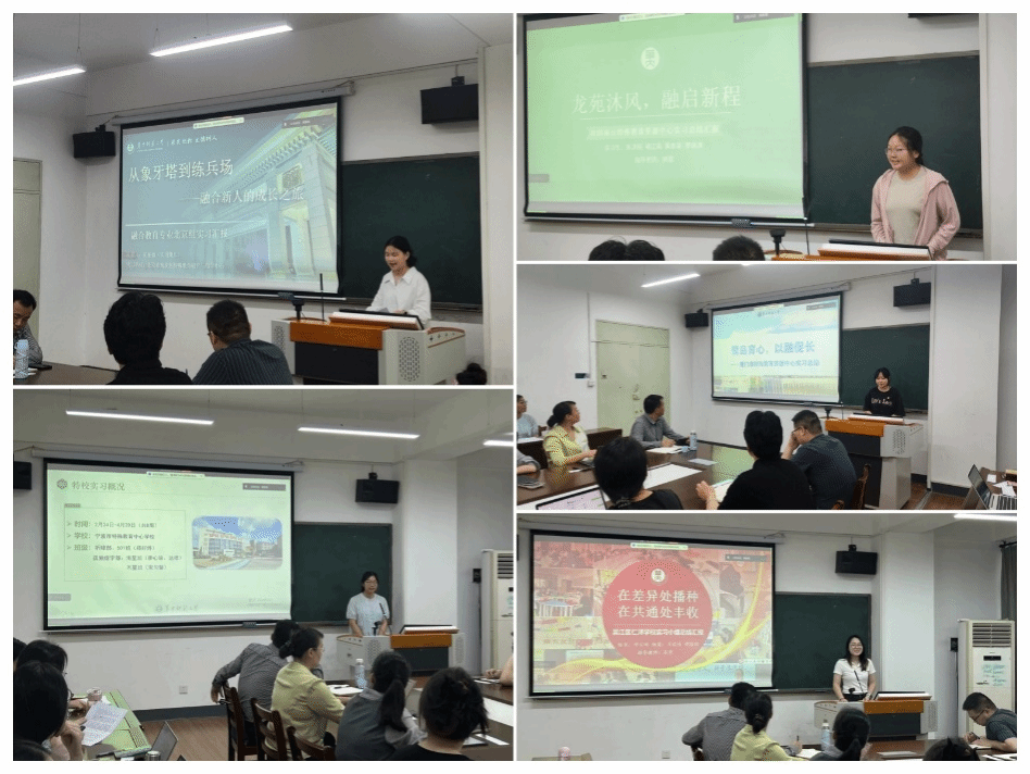 班会伊始,主持人简要介绍了流程安排。北京、宁波、深圳、厦门、吴江五地的实习小组通过详实的数据、生动的案例与深刻的反思,全面展示了实习期间的实践成果、能力提升以及对融合教育一线现状的认知,体现了扎实的专业素养与积极的探索精神。北京实习组组长范丽盈以“从象牙塔到练兵场”为主题,汇报了实习组在教研教学、教研培训、巡回指导、科研工作、活动组织、总结汇报六方面的成果;宁波实习组组长郑好烨从实习内容和实习收获两方面详细汇报了实习成果;深圳南山实习组组长朱洪丽详细介绍了小组教学工作的进展流程;厦门实习组组长姚旭恋汇报了特校教学实践、普校巡回指导、资源教室评估、普校教学支持等实习收获和感悟;吴江实习组组长帅宗琳汇报了小组“特效-融合幼儿园-融合小学”三阶段式实习在教学、班级管理及科研教研上的收获与成果。