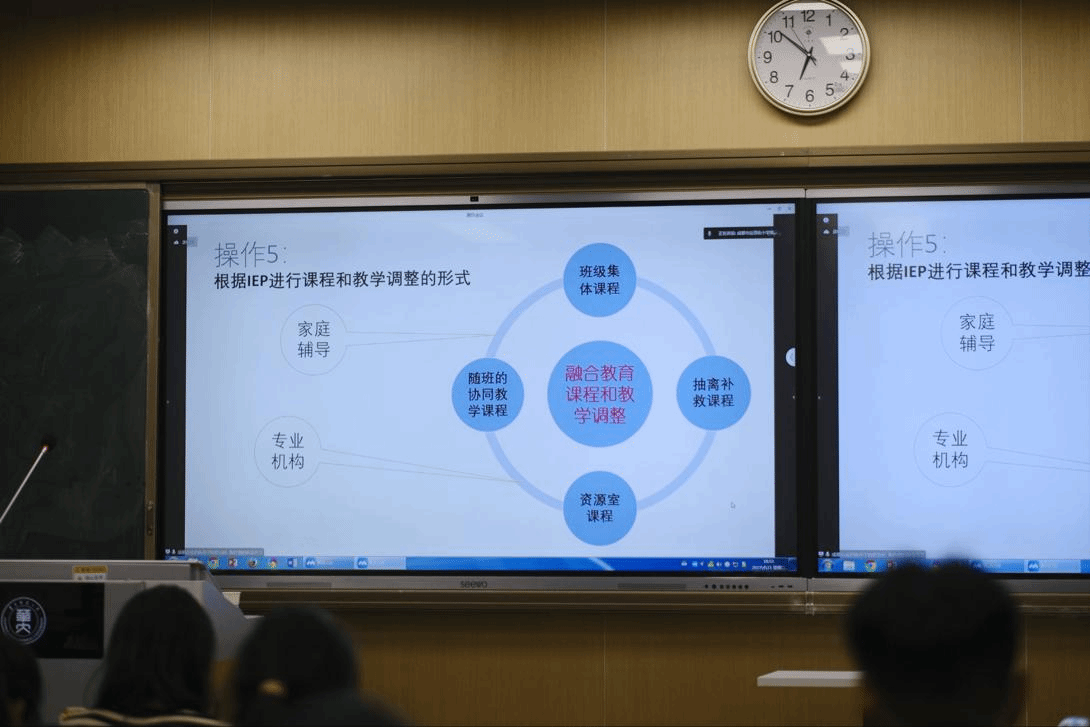 抽丝剥茧,层层递进。在分析融合教育教学调整操作步骤时,陈智慧基于“学习风格、多元智能、通用设计”三个理论,提出了“多样化、适宜性、针对性、融合性”四个原则,介绍了“学情分析-课程解读-教学计划制定-课堂设计实施-反馈调整”的五个流程,总结了“教材呈现、教学组织、教学活动、学生反馈、运用其他支持”的五个方法。她指出,操作中最重要的一步是根据学生IEP目标来灵活选择随班的协同教学课程、班级集体课程、抽离补救课程、资源教室课程等教学形式,结合多种课堂呈现和参与方式,辅以家庭和专业机构帮助来完成教学调整。
