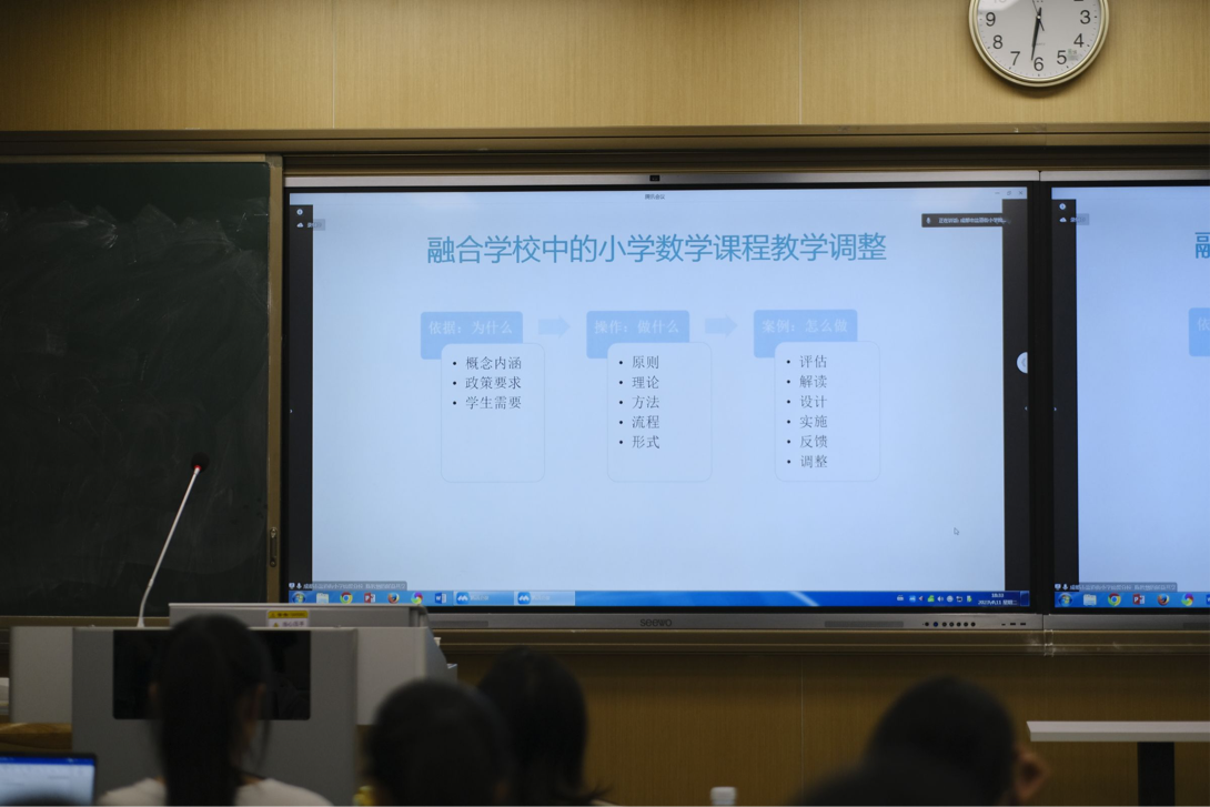 立足实践,以小见大。为加深与会同学对“如何进行融合教育课程教学调整”的理解,陈智慧以本校三年级融合班的数学课堂教学为实例,详细讲解了如何进行课程本位调整的实践。通过播放课堂教学视频,观察教师与三位特殊需要学生A、B、C的课堂表现,陈智慧介绍了如何进行特殊学生现状评估和融合教育课堂教学设计、教学活动实施、教学评价和教学反思。