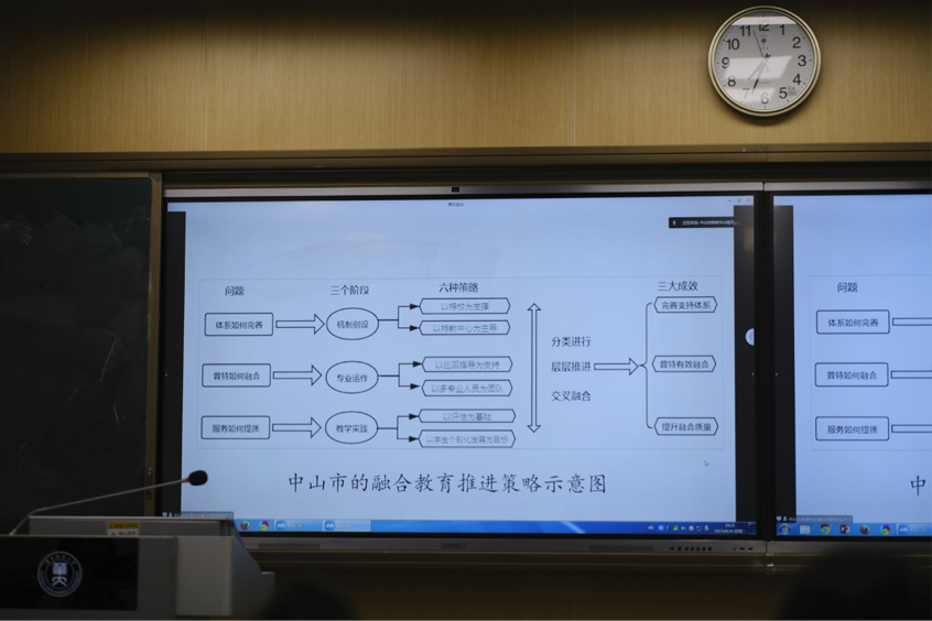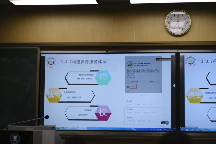 由点到面,深入分析。林开仪从中山市特殊教育发展历程和基本情况出发,为同学们介绍了特殊教育在一线城市的落地情况。他特别介绍了广东省融合教育示范校立项情况和中山市各街镇资源教室建设现状,指出融合教育的发展在广东虽然初有成效,但还有很大的提升空间。